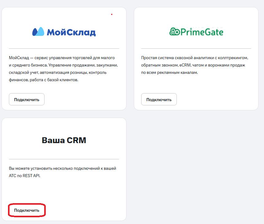 8. Найдите в самом низу списка блок "Ваша CRM" и нажмите на кнопку "Подключить"