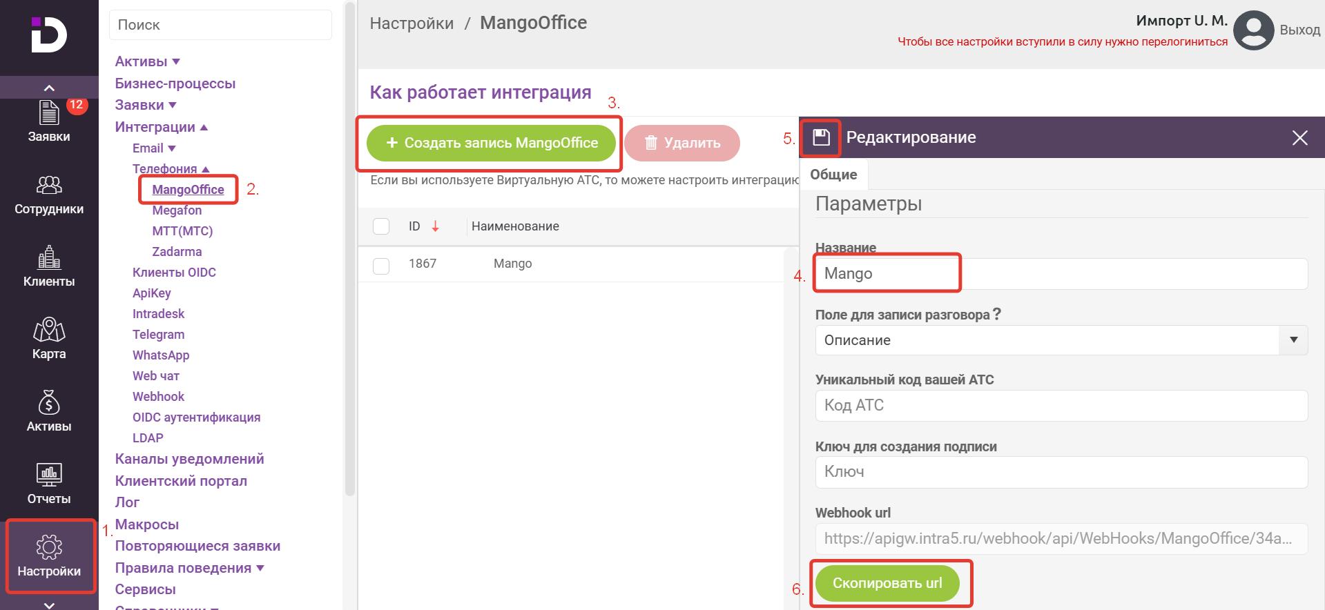 1. В IntraDesk откройте раздел «Настройки –> Интеграции -> Телефония -> MangoOffice».