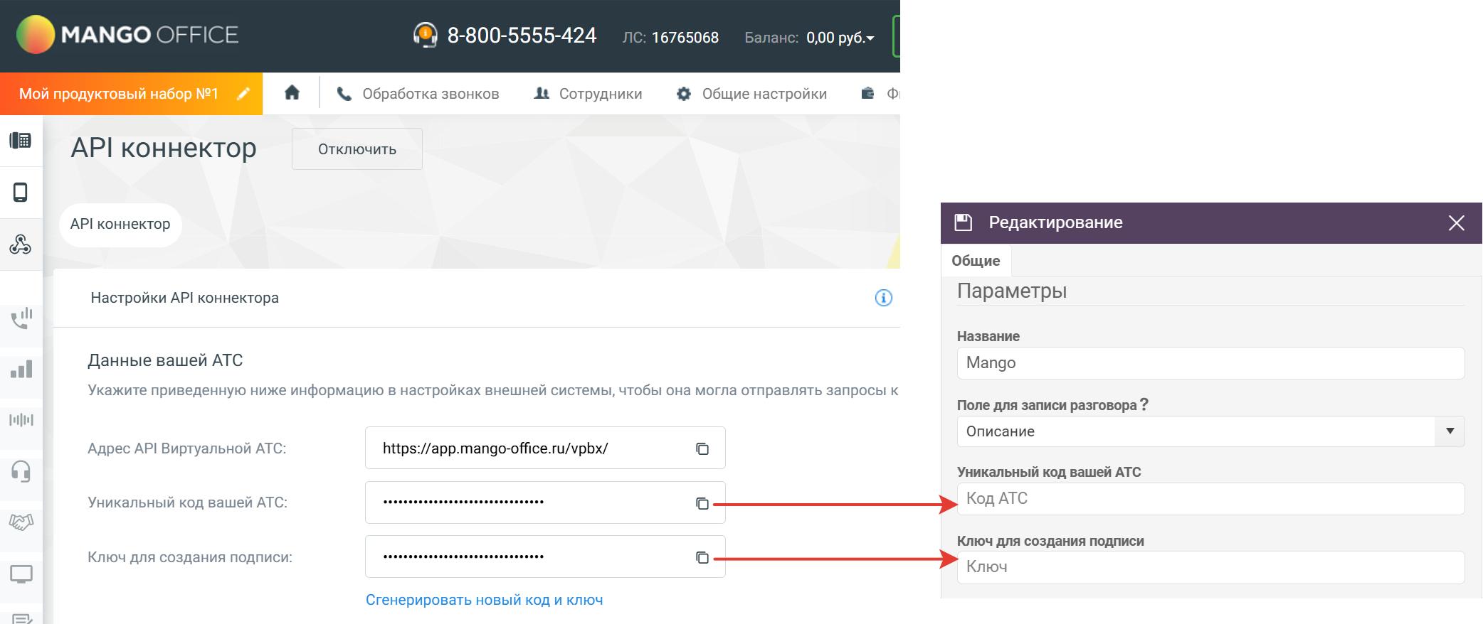 9. Вернитесь на карточку созданной интеграции в Intradesk («Настройки –> Интеграции -> Телефония -> MangoOffice»). Заполните поля "Уникальный код вашей АТС" и "Ключ для создания подписи" соответствующими значениями из раздела "API Коннектора" на карточке телефонии в ЛК ВАТС: