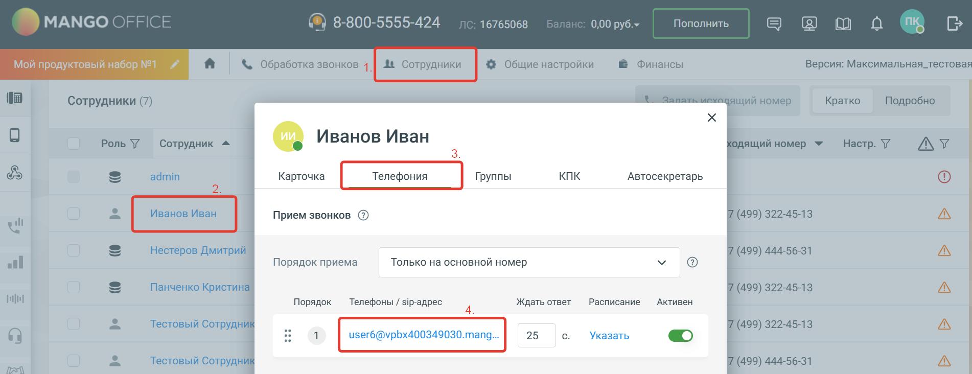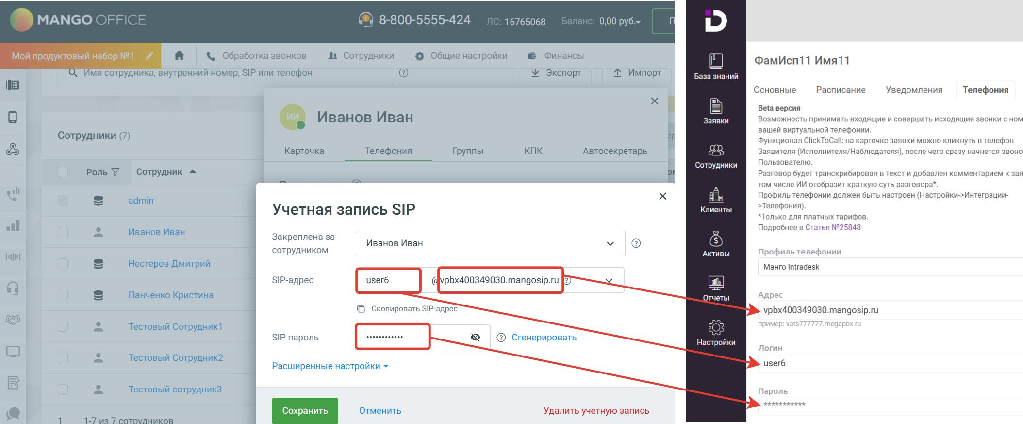 - "Пароль" - указываем SIP-пароль сотрудника