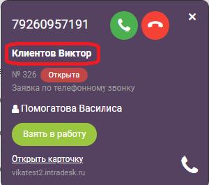 - По входящему звонку от вашего клиента в системе всплывает окно с отображением имени звонящего клиента. Определяется по номеру телефона в базе пользователей клиентов IntraDesk. Рис. 1.