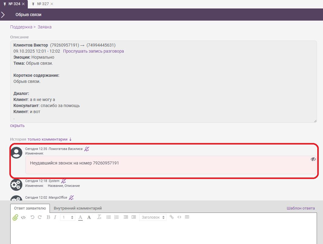 Звонки фиксируются в истории заявки, что позволяет детально проанализировать взаимодействие с клиентом.Рис. 5.