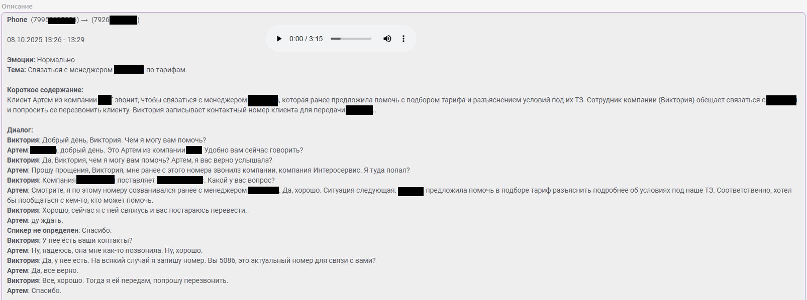 - Возможность прослушать телефонный разговор из заявки, транскрибация речи телефонного звонка в диалог. Эмоциональная оценка диалога