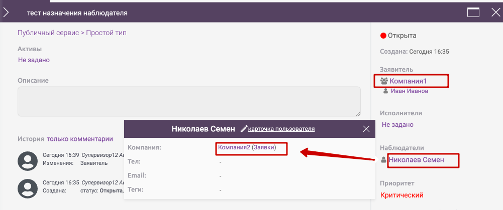 Готово! На "заявке 1" с заявителем из "Компания 1" добавился наблюдателем пользователь клиента "Компания 2"