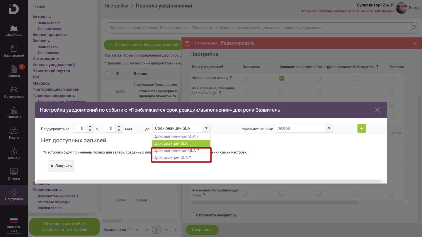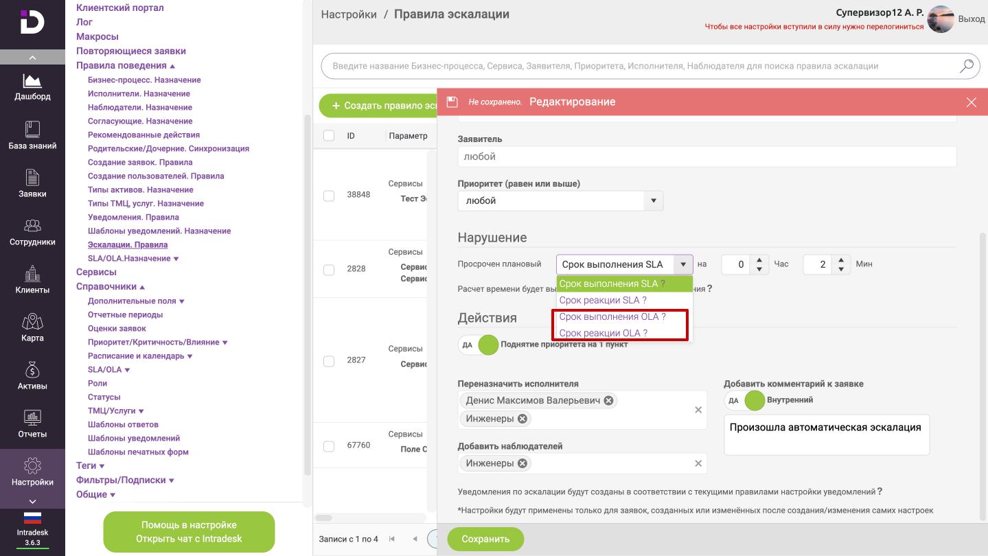 Для настройки эскалаций по этим нарушениям, необходимо открыть "Настройки -> Правила поведения -> Эскалации", в поле "Нарушение - Просрочен плановый" выбрать "Срок реакции OLA" или "Срок выполнения OLA"- "Просрочен срок реакции OLA"