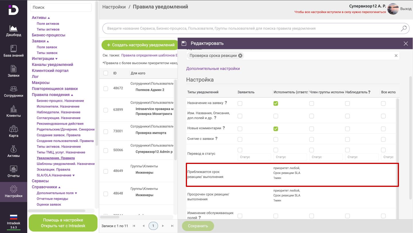 2. Чтобы настроить правила уведомлений для приближающегося срока реакции/ выполнения в типах уведомлений для нужной роли на заявке нажать на "Приближается срок реакции/ выполнения"