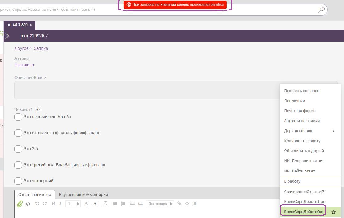 3. Пример вызова сервиса для действия и ответ внешнего сервиса "ошибка" (сообщение на красном фоне)