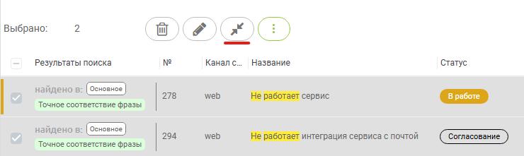 Важно! Объединение заявок не работает: если на удаляемой заявке, вы не являетесь администратором сервиса или  не назначены Исполнителем или не состоите в Группе Исполнителей.