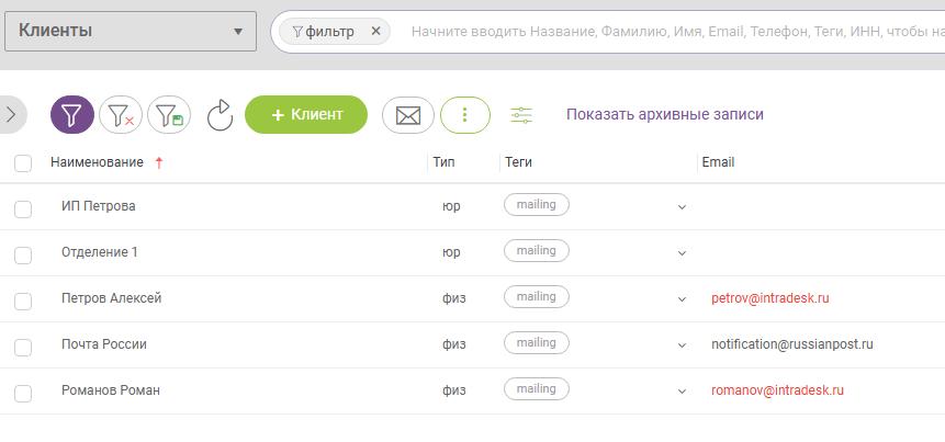 2. В разделе Клиенты/Пользователи клиентов настройте фильтры для нужных клиентов, которым вы хотите организовать рассылку (например, по каким-то тегам "mailing", "Новостная рассылка").