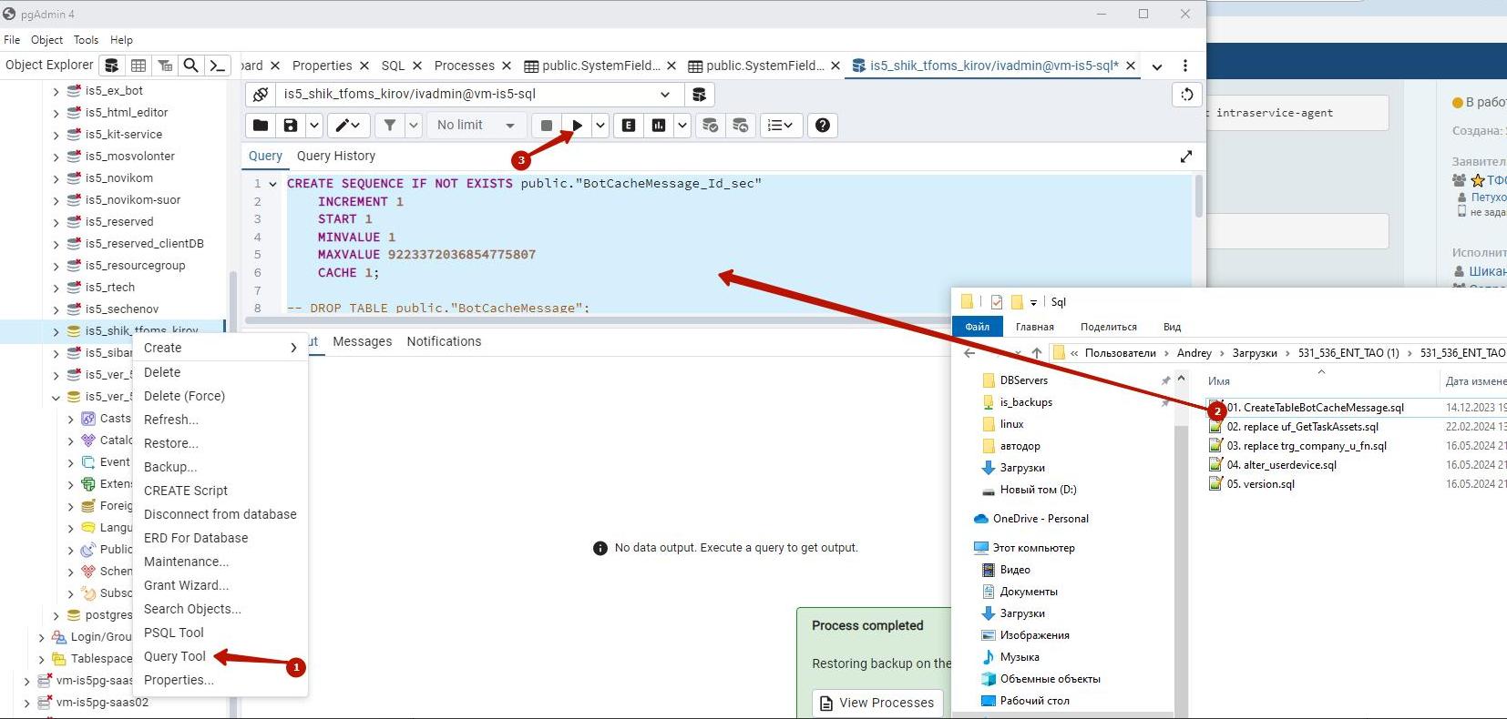 потом в query tool удаляете строки уже выполненного скрипта и перетаскиваете следующий файл и так до последнего по порядку.