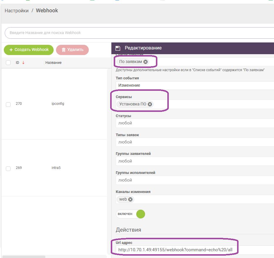 В атачменте приложен исходный код на языке .NET веб-сервиса, отрабатывающего запросы https://10.70.1.49:49155/webhook . Соответственно именно такой URL мы прописали.