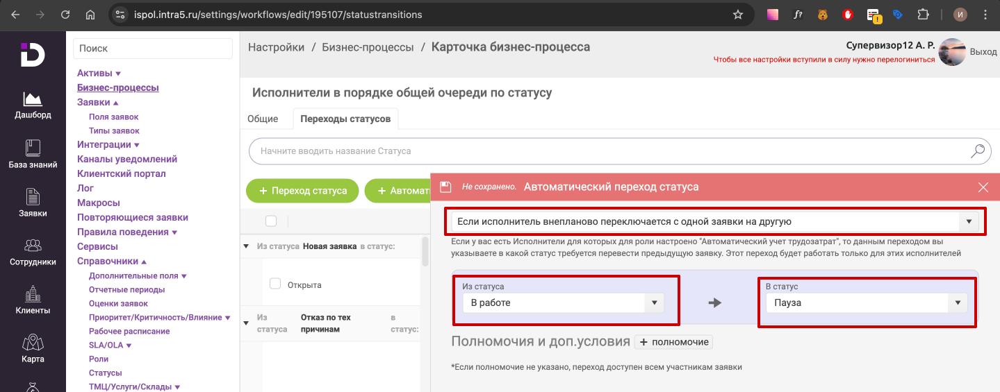2. Настроить автопереход статуса, если исполнитель внепланово переключается с одной заявки на другую. Например, переход из статуса "В работе" в статус "Пауза"