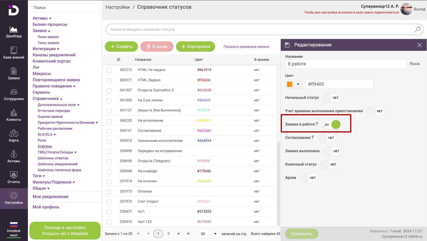 1. В "Настройки - Справочники - Статусы" открыть статус "В работе".