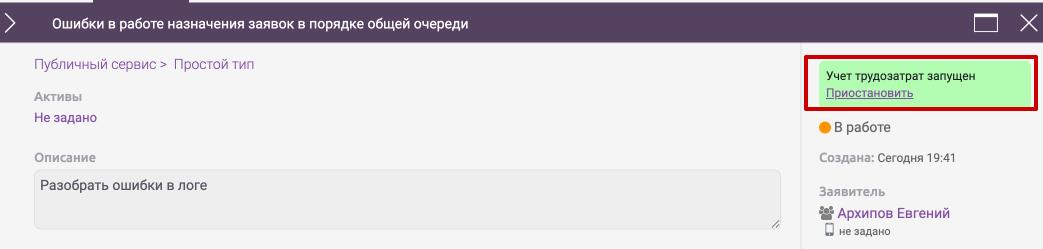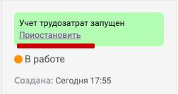 Для того, чтобы остановить автоматический учет трудозатрат необходимо нажать "Приостановить". В этот момент, заявка перестает быть активной, статус не меняется, списываются потраченные часы.