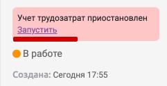 Для того, чтобы возобновить автоматический учет трудозатрат, необходимо нажать "Запуск". В этот момент, заявка становится активной, начинается автоматический учет трудозатрат.