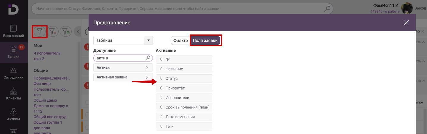 Для того, чтобы понять какая заявка у исполнителя активная, можно вывести на список заявок столбец "Активная заявка", для этого нужно открыть список заявок, нажать на фильтр, перейти на вкладку "Поля заявки", перетянуть поле "Активная заявка" в правый список: